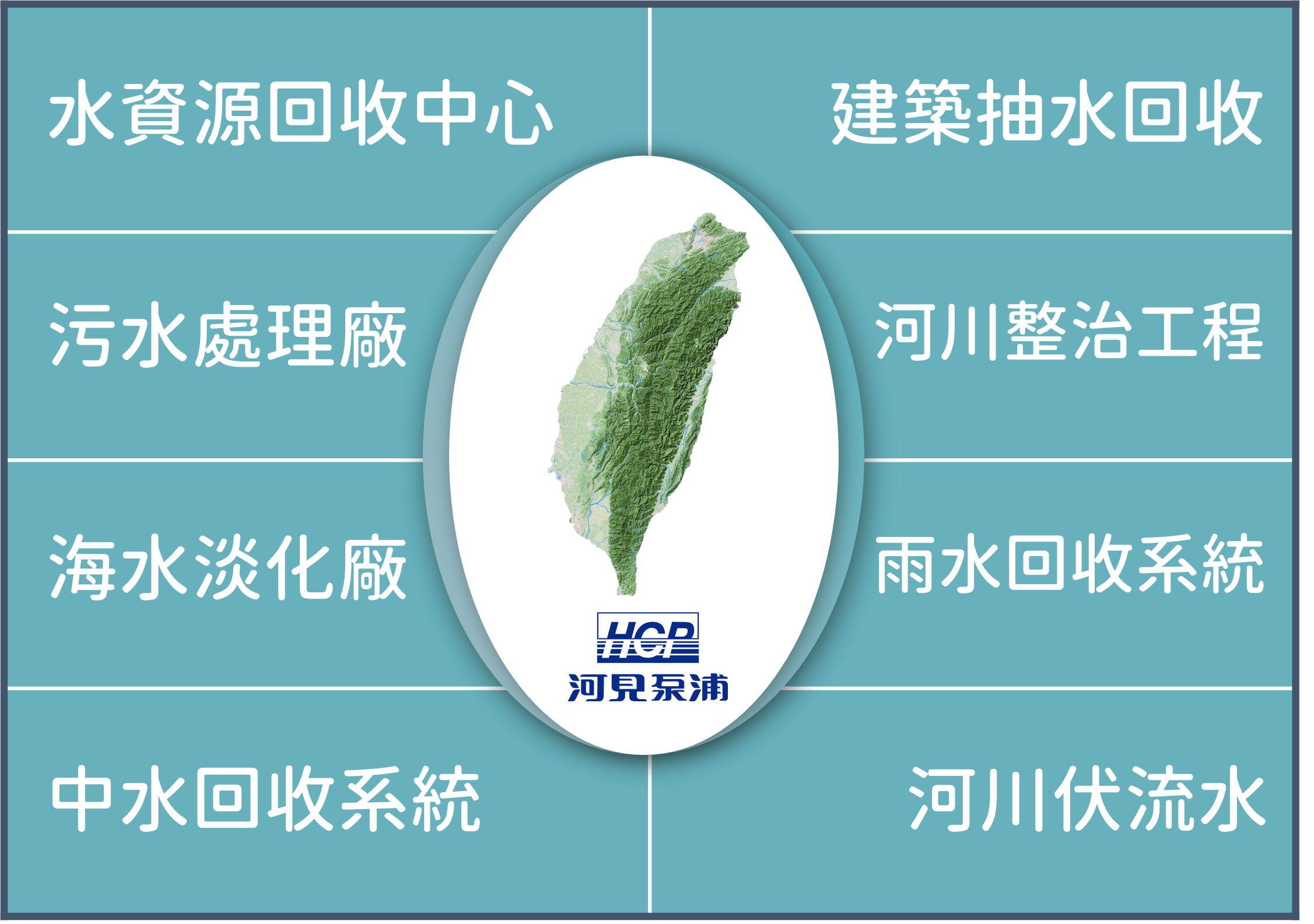 在台灣,河見泵浦隱身在各個有水的地方,日夜扮演著流體運送的重要角色,河見泵浦常用的環境有:各地的水資源回收中心、污水處理廠、海水淡化廠、中水回收系統、建築抽水回收、河川整治工程、河川伏流水、雨水回收系統等。