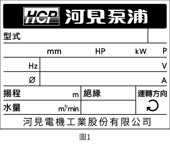 正確地使用沉水泵浦,以及避免不必要之行為是預防人體觸電之不二法門,其次為加強各種安全保護裝置和措施等,一般預防對策有下列方式 :1. 沉水泵浦使用前應查看性能銘牌 (圖1),了解泵浦使用基本資訊,以免誤用電壓或過負荷使用。而泵浦運轉中,電壓變動容許值必須在±10%以內。