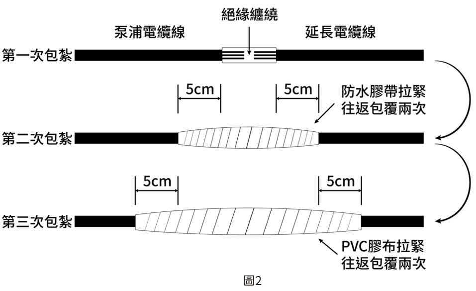 2. 防止馬達及電纜線遭受外部因素破壞其絕緣性能,沉水泵浦電纜線若必須使用中途接續時,應將接續及絕緣包紮良好 (圖2)。遵守【電纜線不纏繞、不破損、不裸露】三大原則,定時巡檢設備,當電纜線出現龜裂 (圖3) 狀況,建議送修更換。