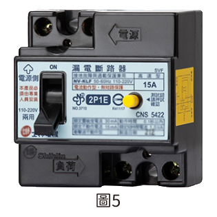 4.一勞永逸的保護:泵浦安裝時,務必使用安全合格的電力控制盤,且一定要加裝【漏電斷路器】(圖5)和過載保護器(Over relay),保護整個用電迴路,並確實連接接地線 (綠色 / 黃綠色),避免馬達故障漏電時,可能會造成的漏電意外事故。