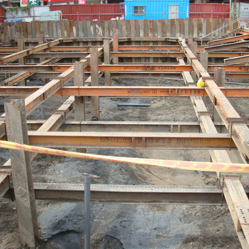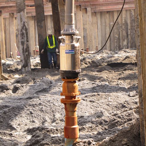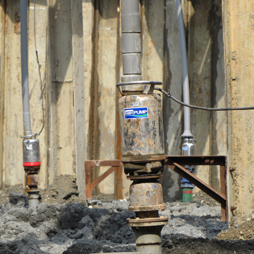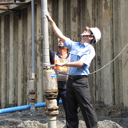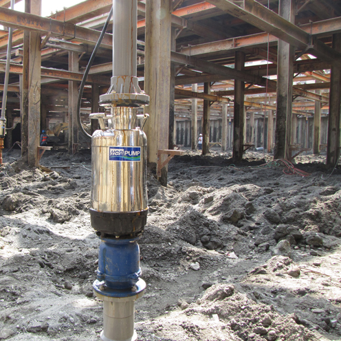 本案為環球購物中心全台第三家分店,坐落於南部市中心,預計將於2012年第四季開幕,佔地約一千五百多坪,完工後營運賣場約七千坪,樓高5層;預計開幕後將創造當地上千個就業機會,帶動整體商圈活絡。此基地開挖面在地下水位之下,為了使開挖面保持穩定狀態,以及工作面保持乾燥便於施工,因此將地下水位降至開挖面下。本案工程裝置數排小口徑點井,點井上接豎管及集水幹管,使用IC泵浦抽出地下水以降低水位。工程基礎束水時間影響後續工程進度極為重要,河見IC水陸兩用泵浦系列符合24小時運轉要求,並具備鉻鋼材質葉片,適合含砂水質環境使用,使用壽命大幅延長,可有效的節省後續維修成本。IC系列為全面水冷式馬達,可維持長時間運轉,馬達省電效率高,防水等級符合IP68國際標準。IC系列優異的鉻鋼葉輪設計,可提供高揚程大水量的性能表現及極佳的吸力,適用於井筒抽水;亦可抽水送水兩用,取下過濾網接上地下井的水缸,即可為陸上抽水機使用。